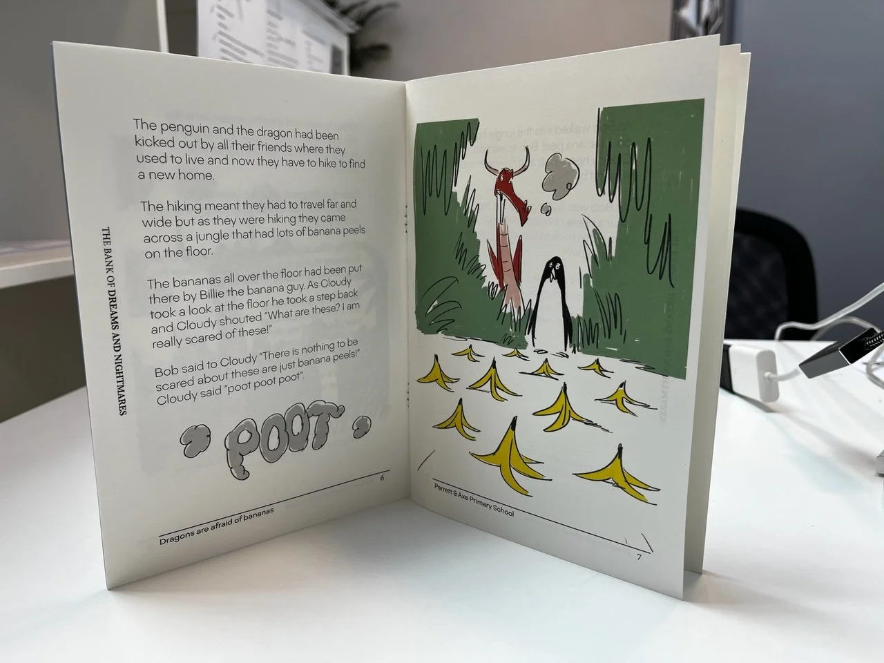 The Bank of Dreams and Nightmares’ Grumpy Manager called the children on the Red Telephone to dismiss their story writing skills, but by the end of the morning he was so impressed with their word craft that he agreed to put their stories in the bank vault, and also to publish their book. Each child is now a published author, with fantastic illustrations by Adam Beer.